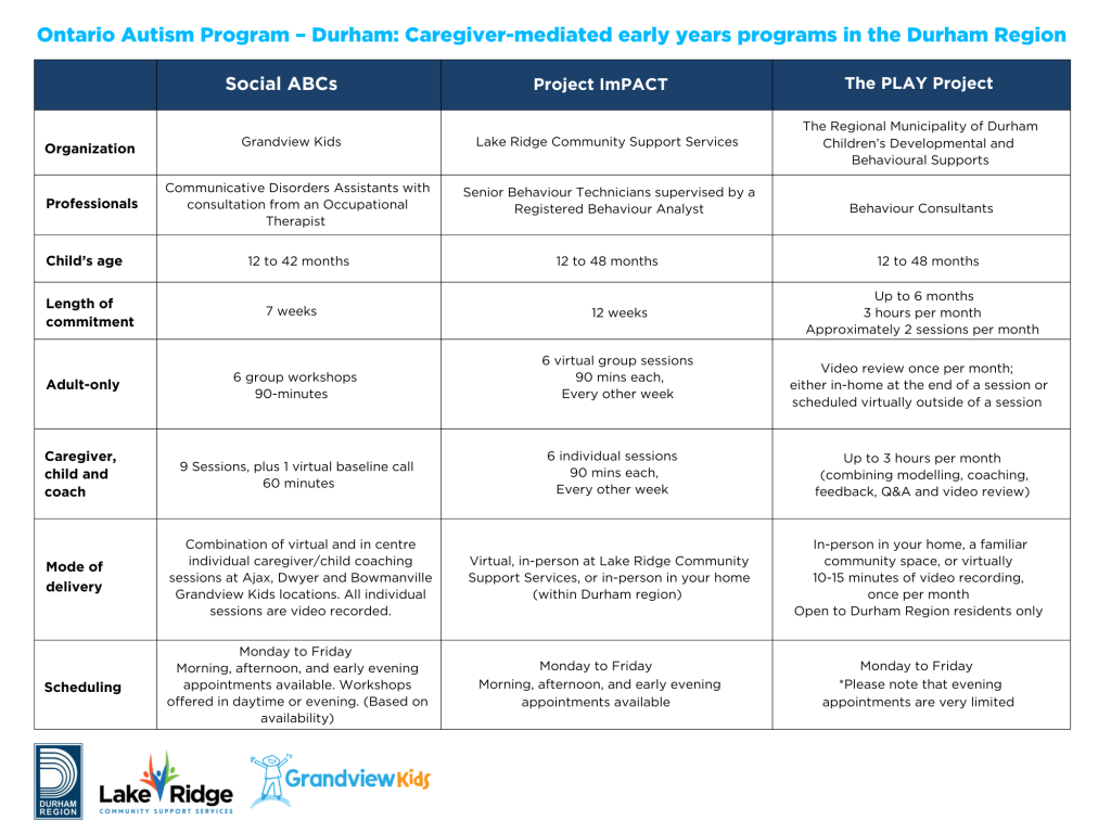 The Ontario Autism Program, Durham (OAP-D) partnership provides caregiver-mediated programs through Grandview Kids, Lake Ridge Community Support Services, and The Regional Municipality of Durham. There are three programs to choose from. Children may only participate in one of these programs per fiscal year (April to March). Please note that each program has a different age range (see chart below).