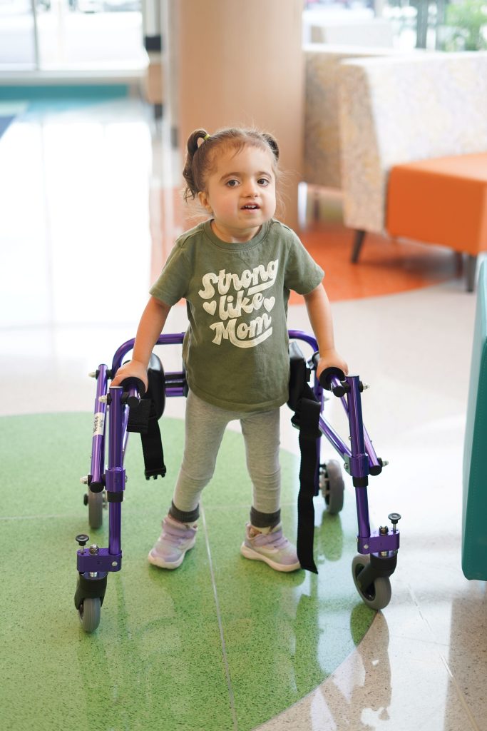 She receives regular hearing checks and sees specialists to monitor her growth and development. She also has custom orthotics, trialled different walkers and is working toward greater independence every day. Scarlett has progressed more quickly than anyone expected, moving from knee-foot orthoses (KFOs) to ankle-foot orthoses (AFOs) to supramalleolar orthoses (SMOs) in record time. “Her physiotherapist, Jessica T., hadn’t seen anyone make that kind of progress in such a short period,” says Chris. “It gave us real hope.”
