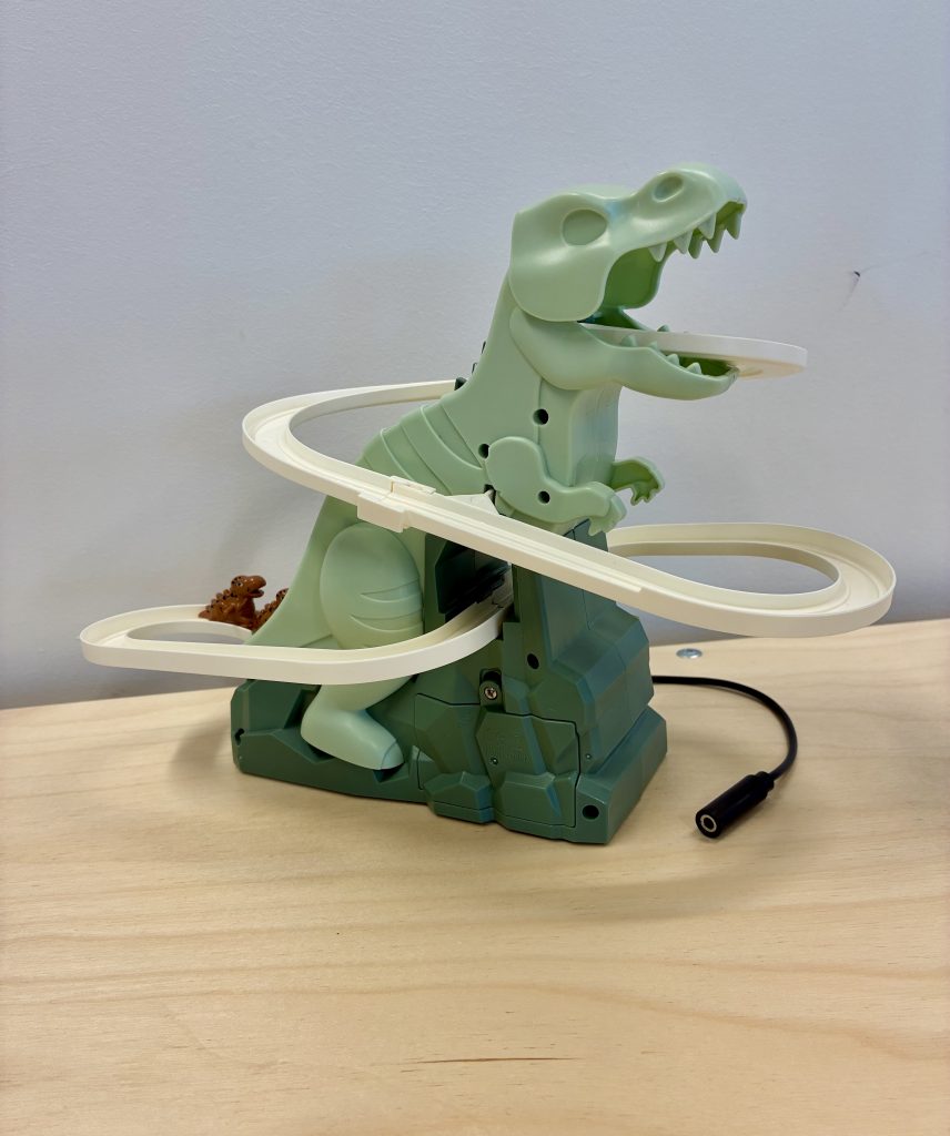 Description: This new addition to our inventory was designed by a Durham District School Board student! As a student presses the switch the dinosaurs climb the stairs and roll down the track. Also has lights and sounds which draw attention.