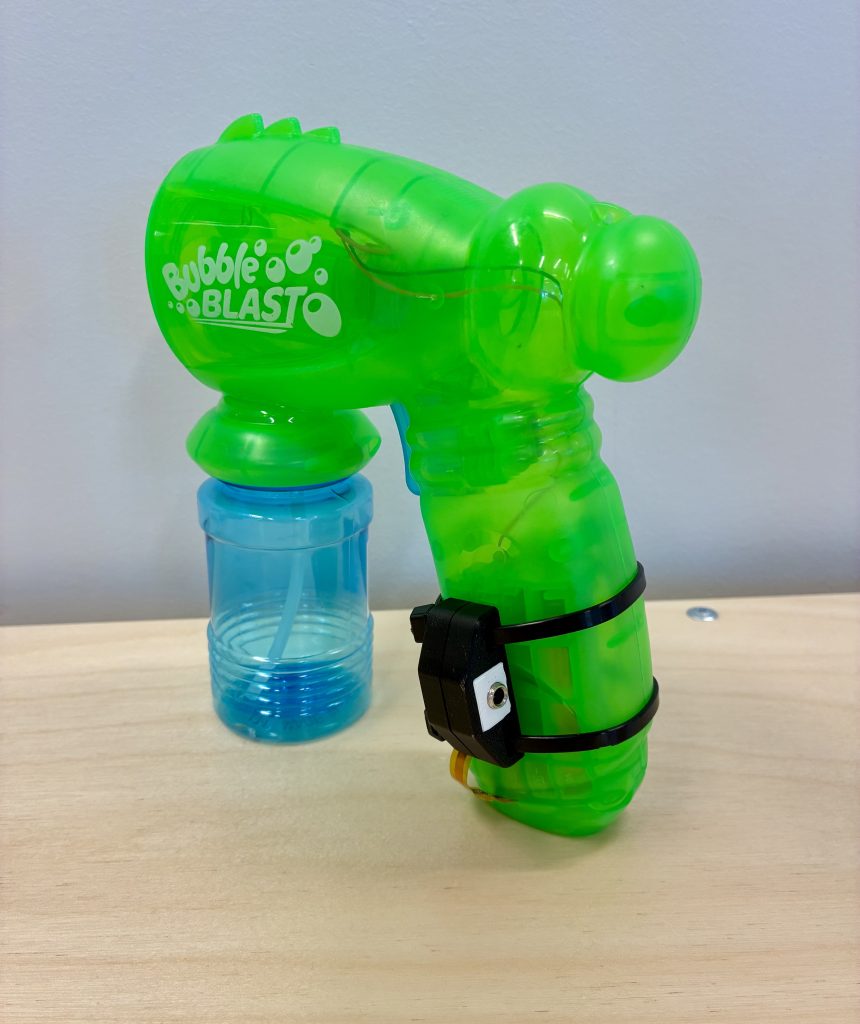 Description: This switch adapted bubble machine is a great option for all students. Encourage peer engagement as friends blow and pop bubbles together!